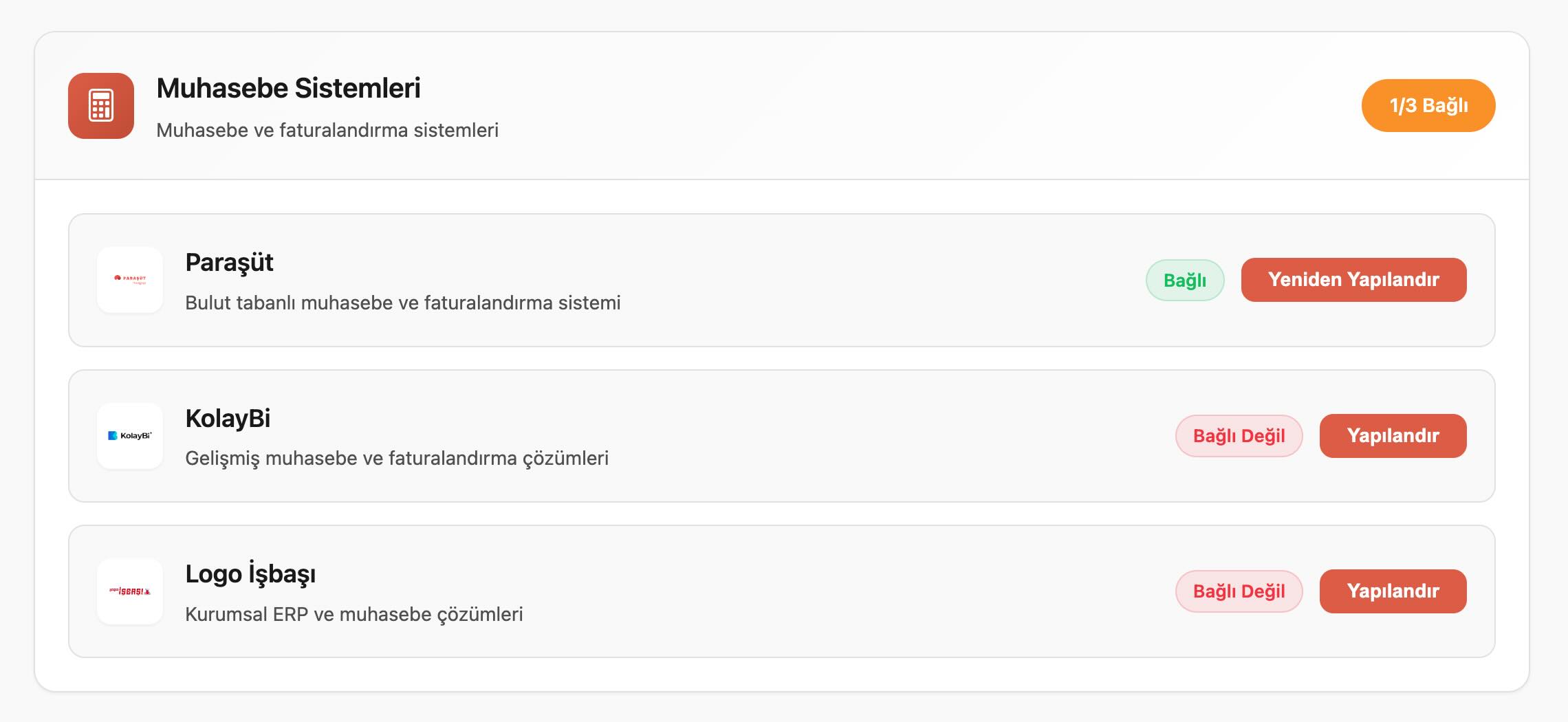 Paraşüt mı, KolayBi mi, Logo mu kullanıyorsunuz? Farketmez! FaturaFlow direkt entegre olur. Faturalar, ödemeler, stok - hepsi otomatik işlenir.